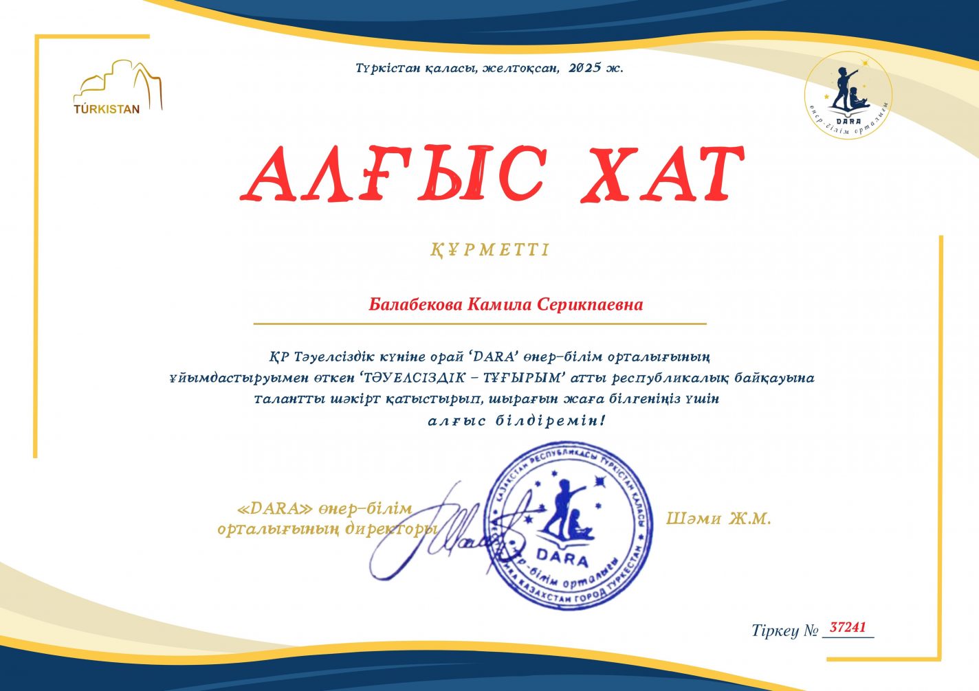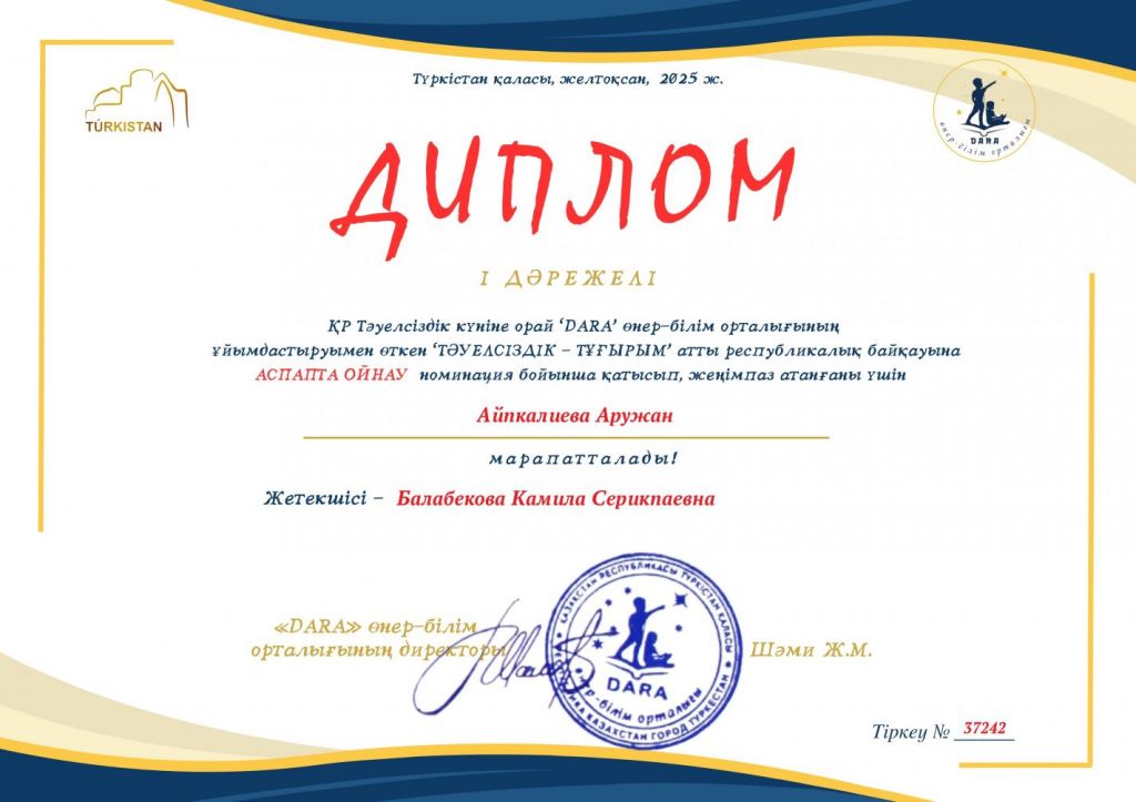 Түркістан қаласында “ Дара” өнер орталығының ұйымдастыруымен ҚР Тәуелсіздігіне орай өткізілген “ Тәуелсіздік- Тұғырым” республикалық байқауында 1-дәрежесі дипломмен мектебіміздің фортепиано сыныбы оқушысы Айпкалиева Аружан ( оқытушысы Балабекова К.С. ) марапатталды. Құттықтаймыз!