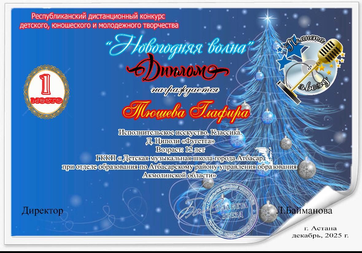"Новогодная волна" республикалық балалар және жастар шығармашылығы байқауының жеңімпазы Тюшева Главира I дәрежелі дипломмен марапатталады. Құттықтаймыз!!!