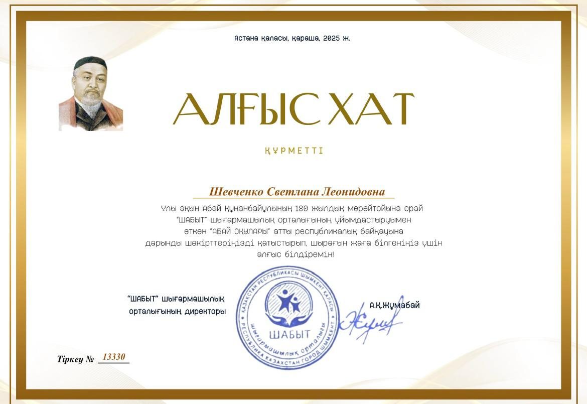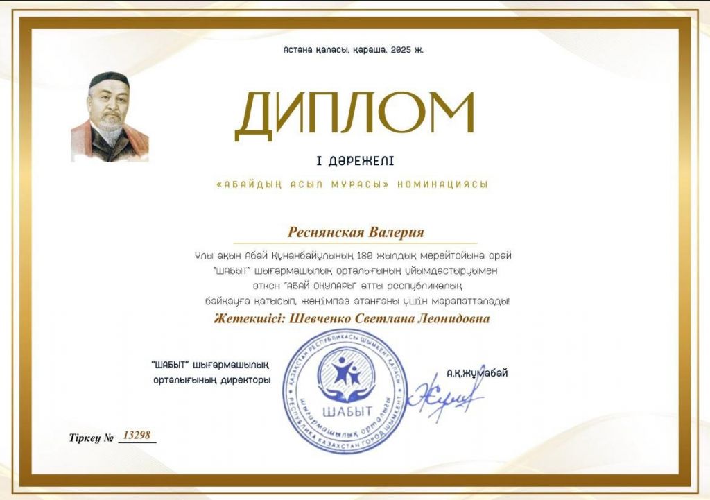 Ұлы ақын Абай Құнанбайұлының 180 жылдық мерейтойына орай "Шабыт" шығармашылық орталығының ұйымдастыруымен өткен " Абай оқулары" атты республикалық байқауының жеңімпазы Реснянская Валерия I дәрежелі дипломмен марапатталады. Құттықтаймыз!